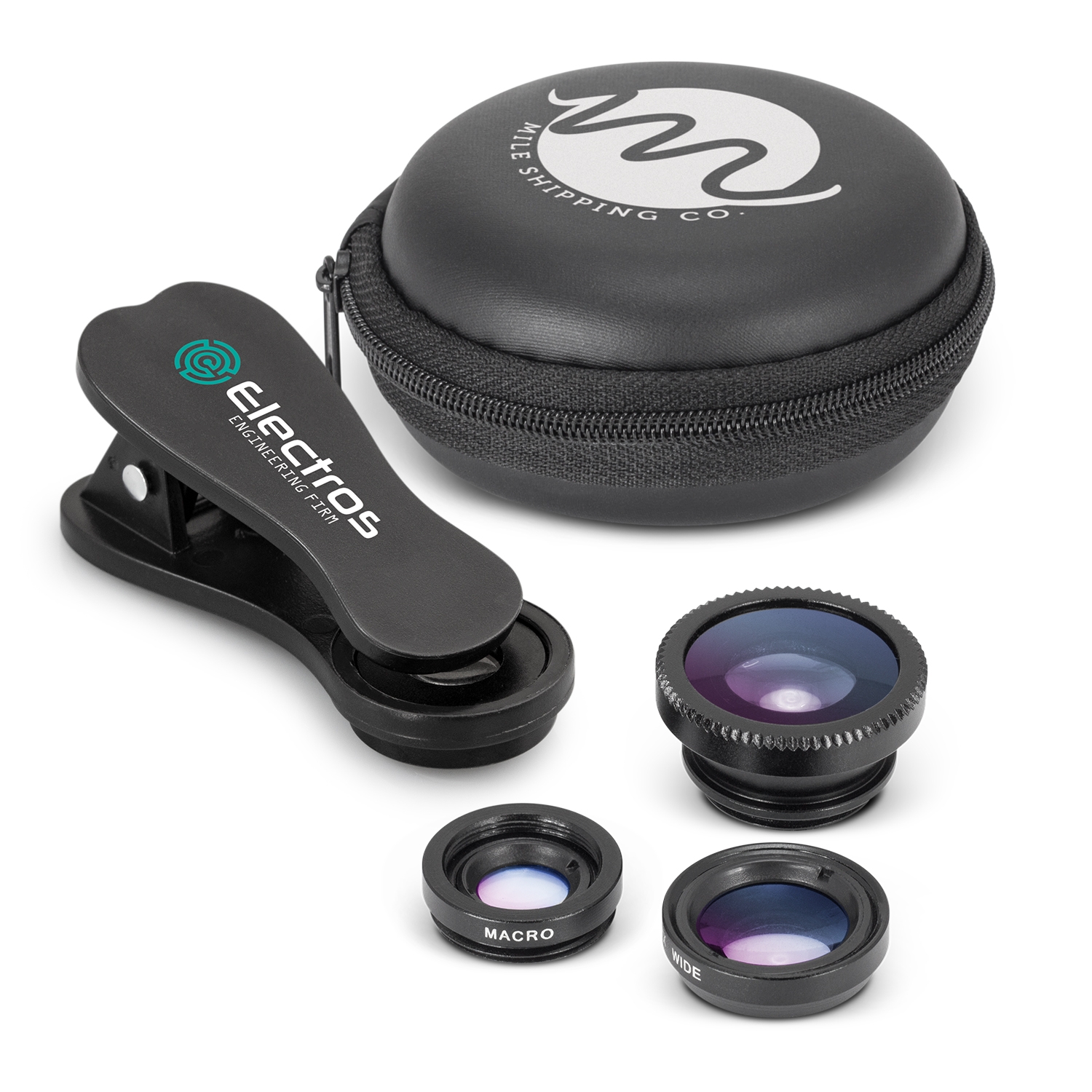 Lens kit for smartphones which is presented in an compact EVA carry case. It has a 180 degree fish eye lens, a .67 wide angle lens and a macro lens for taking close ups. The lenses screw into a spring loaded clip which holds them in place over the camera of the smartphone. Branding is on the EVA carry case.