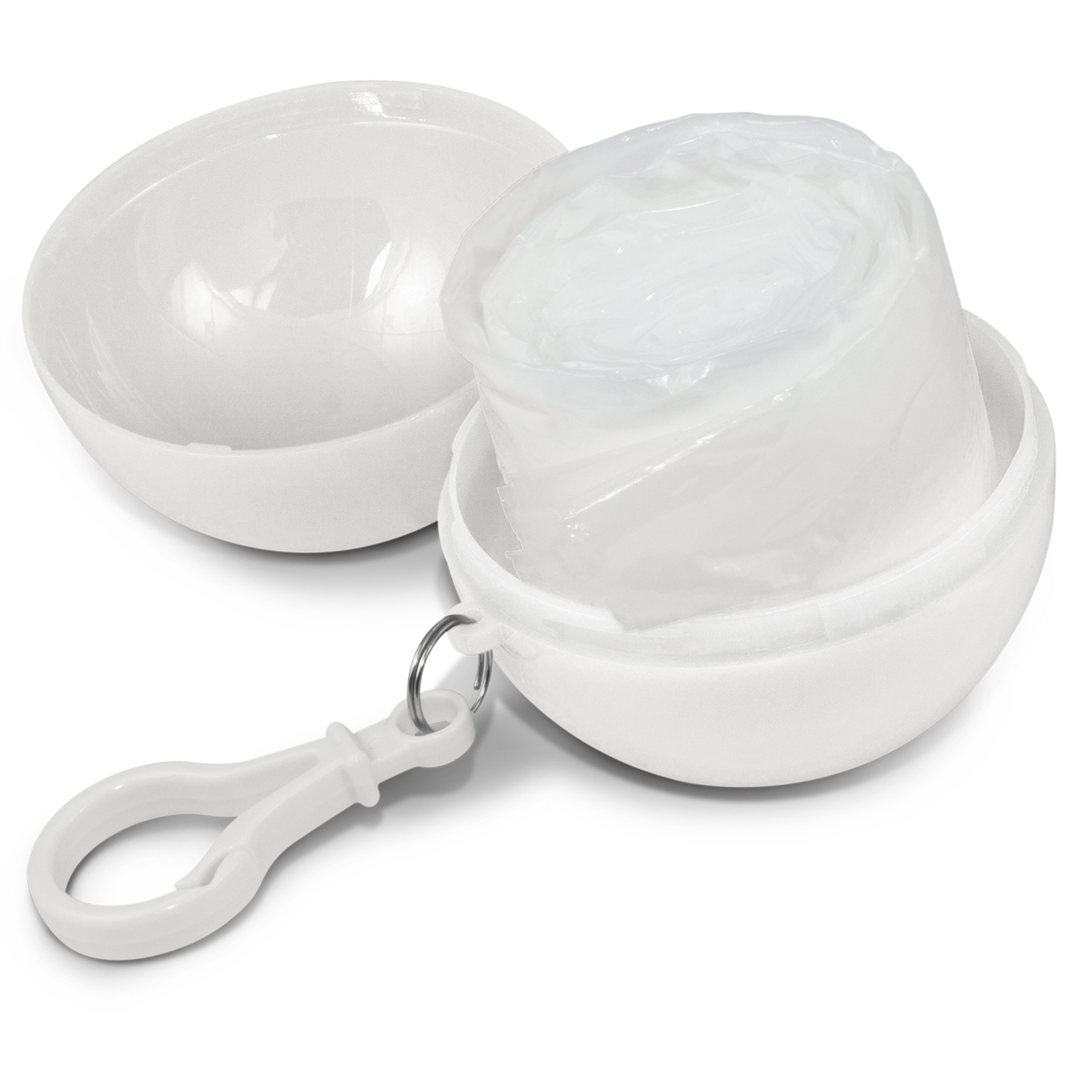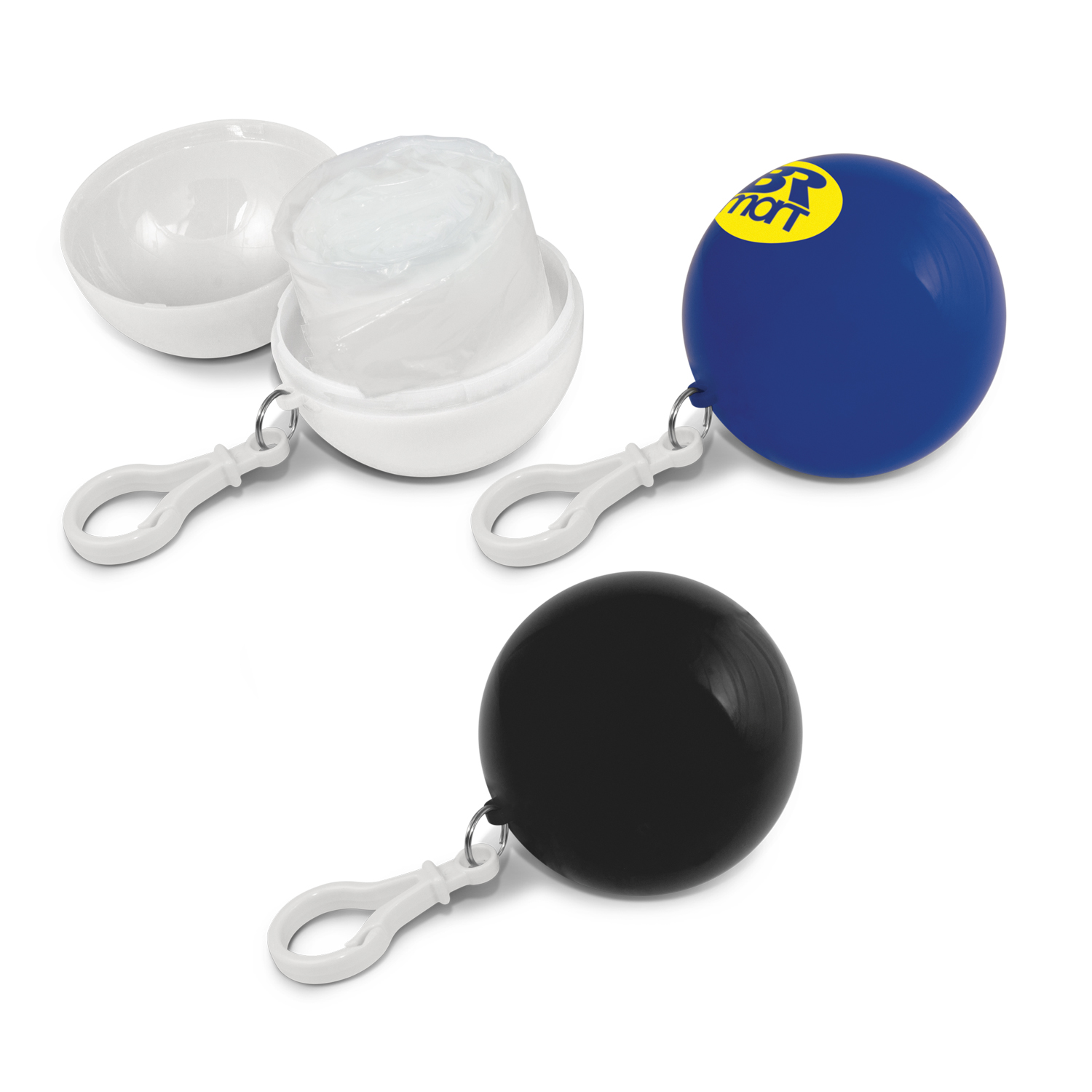 Handy emergency raincoat in a plastic ball shaped case. It has a plastic clip which is ideal for attaching it to a bag or a belt loop.