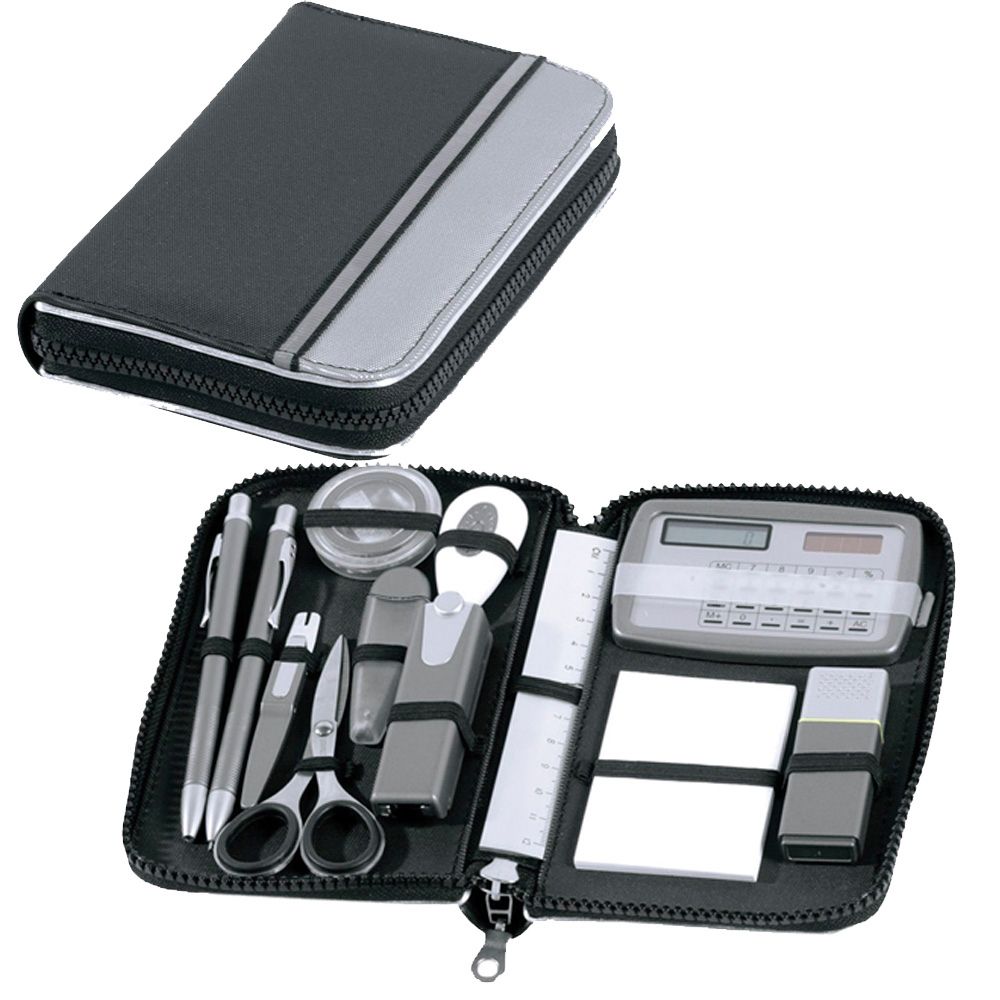 13 Piece Stationery Set - Includes mechanical pencil, ballpoint pen, pencil leads, paperclips, staples, staple remover, scissors, eraser, stapler, ruler, calculator, memo pad, highlighter pen.