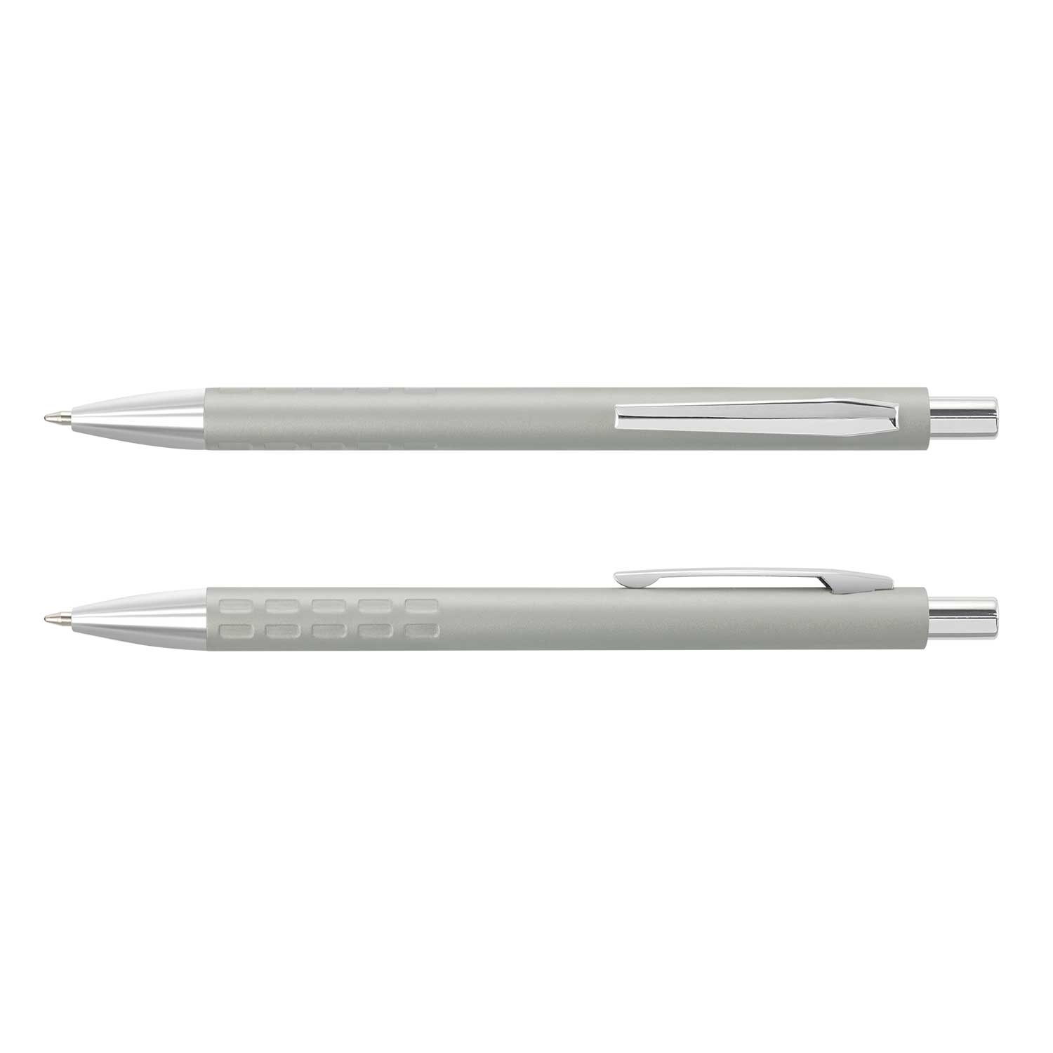 Retractable aluminium ball pen with a debossed pattern on the grip, a matt lacquered barrel and shiny chrome accents. It has a blue large volume refill with 800 metres of writing ink and black ink is available for an additional charge. Vienna laser engraves to an oxidised white colour and can be presented in an optional black velvet sleeve or a gift box.